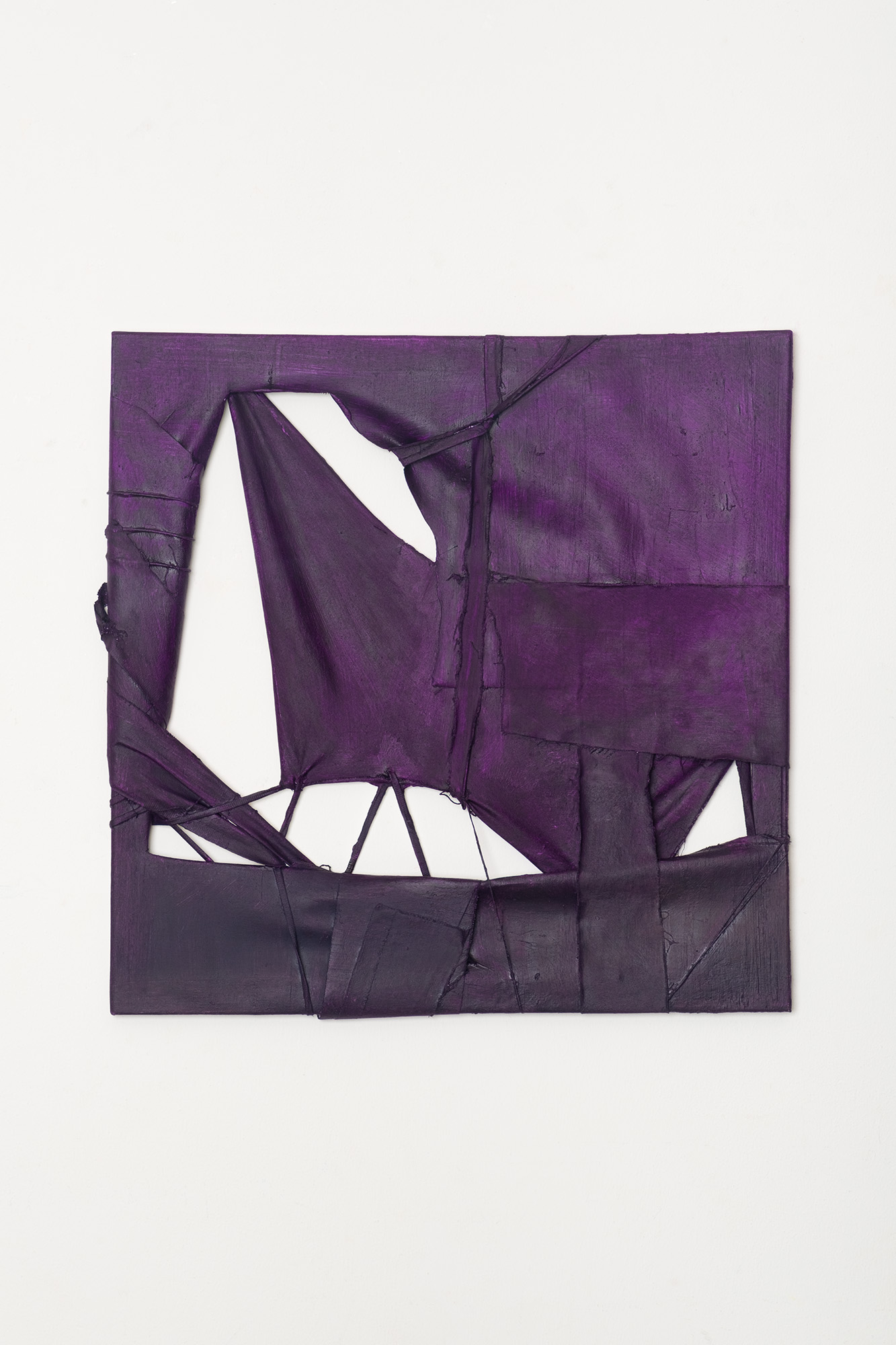 Rafistolage 8, 58 x 58 x 3 cm, oil on scrap synthetic canvas, cotton, laces, strings, 2021-2023 ©Danny Leal