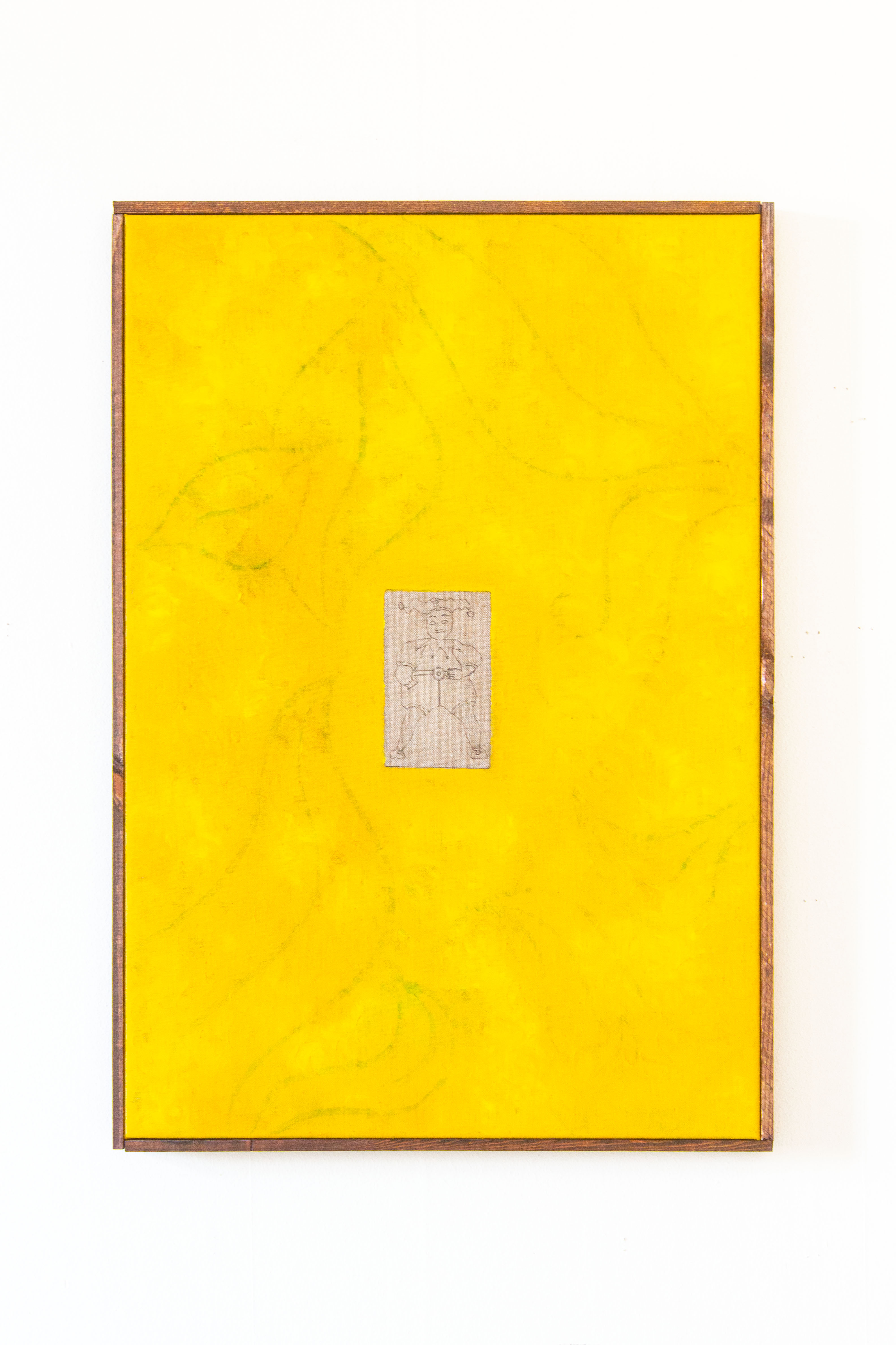 The Court Jester 3, 53 x 33 x 2.5 cm, oil, graphite, ink on canvas, walnut stain on wooden frame, 2023 ©Danny Leal