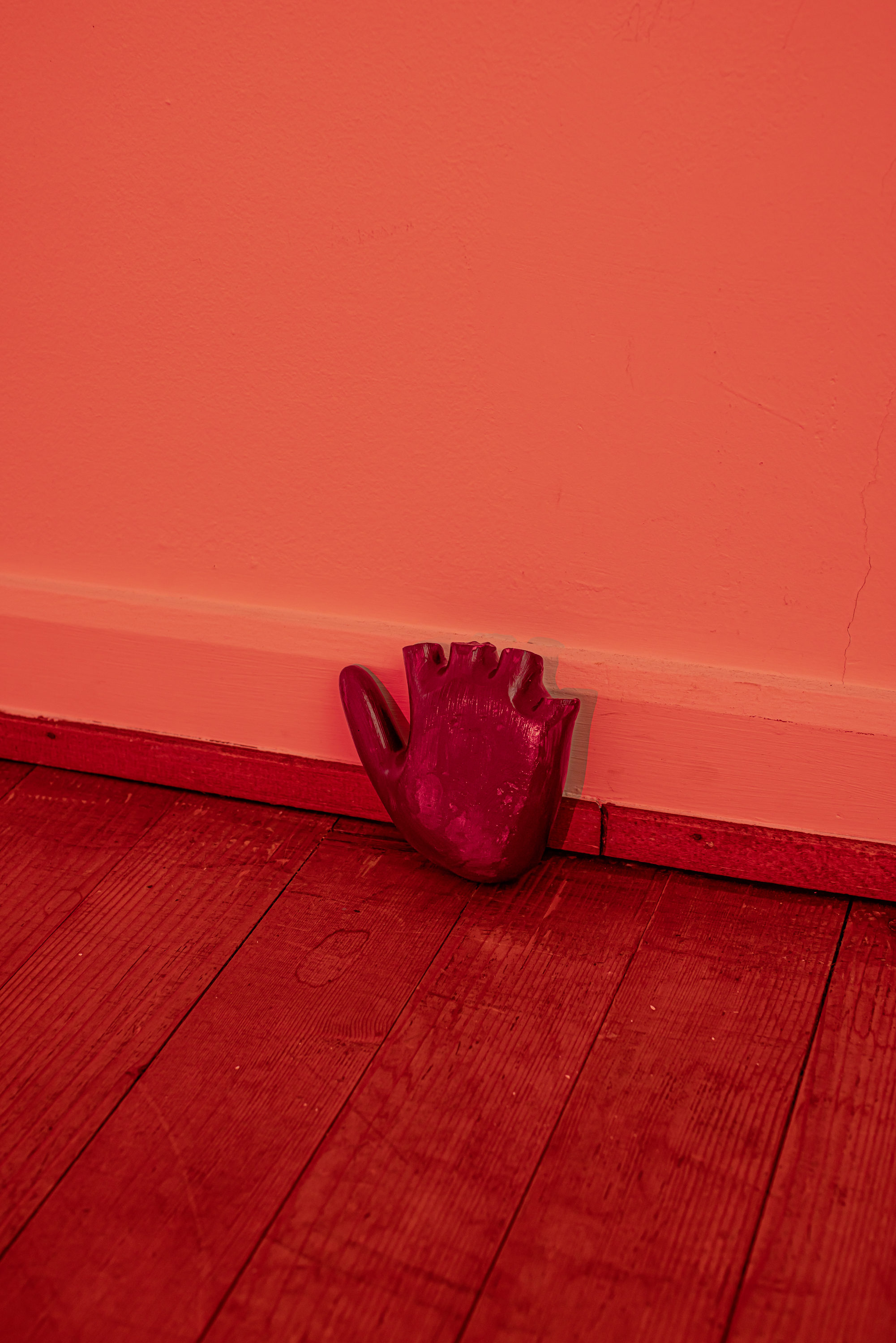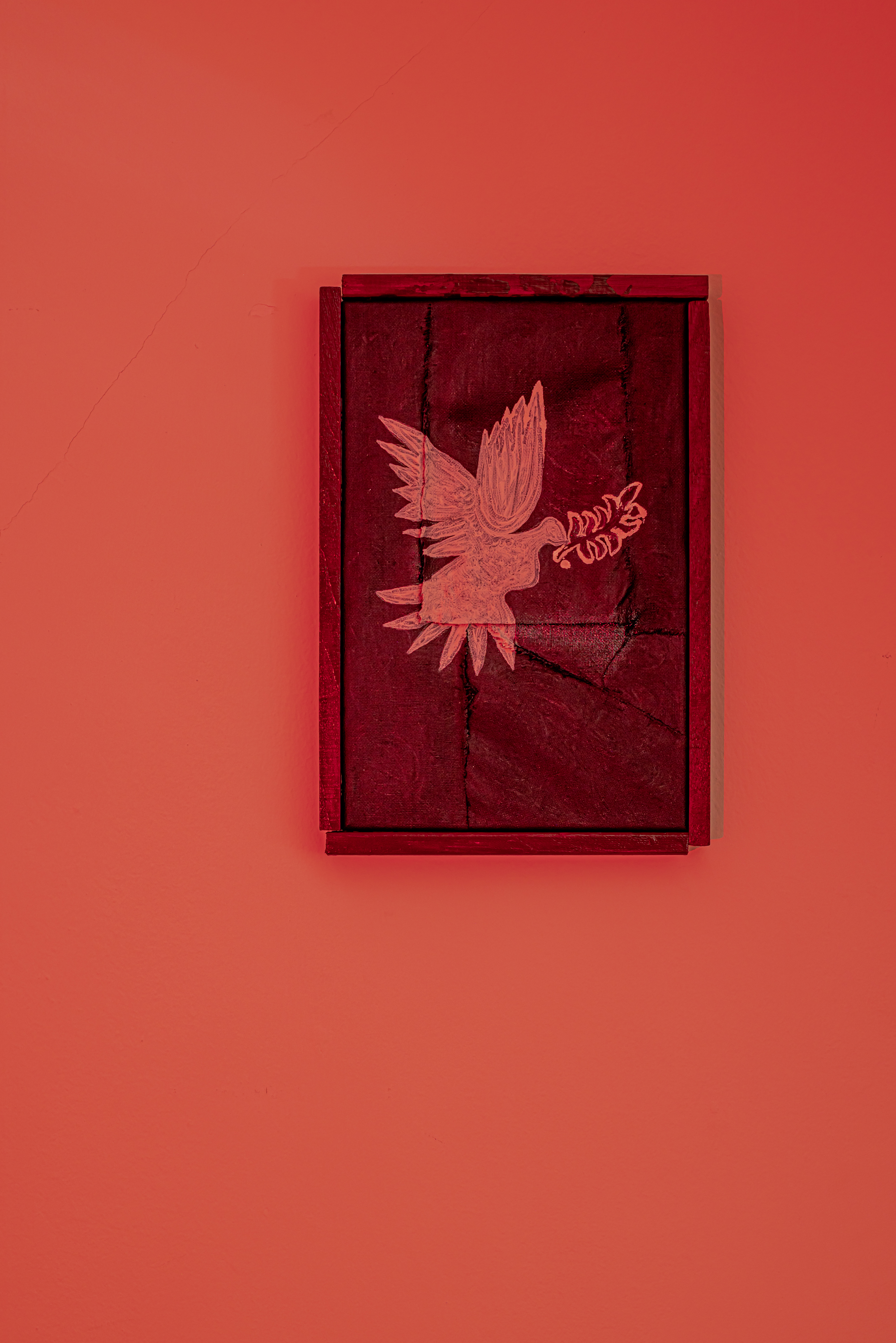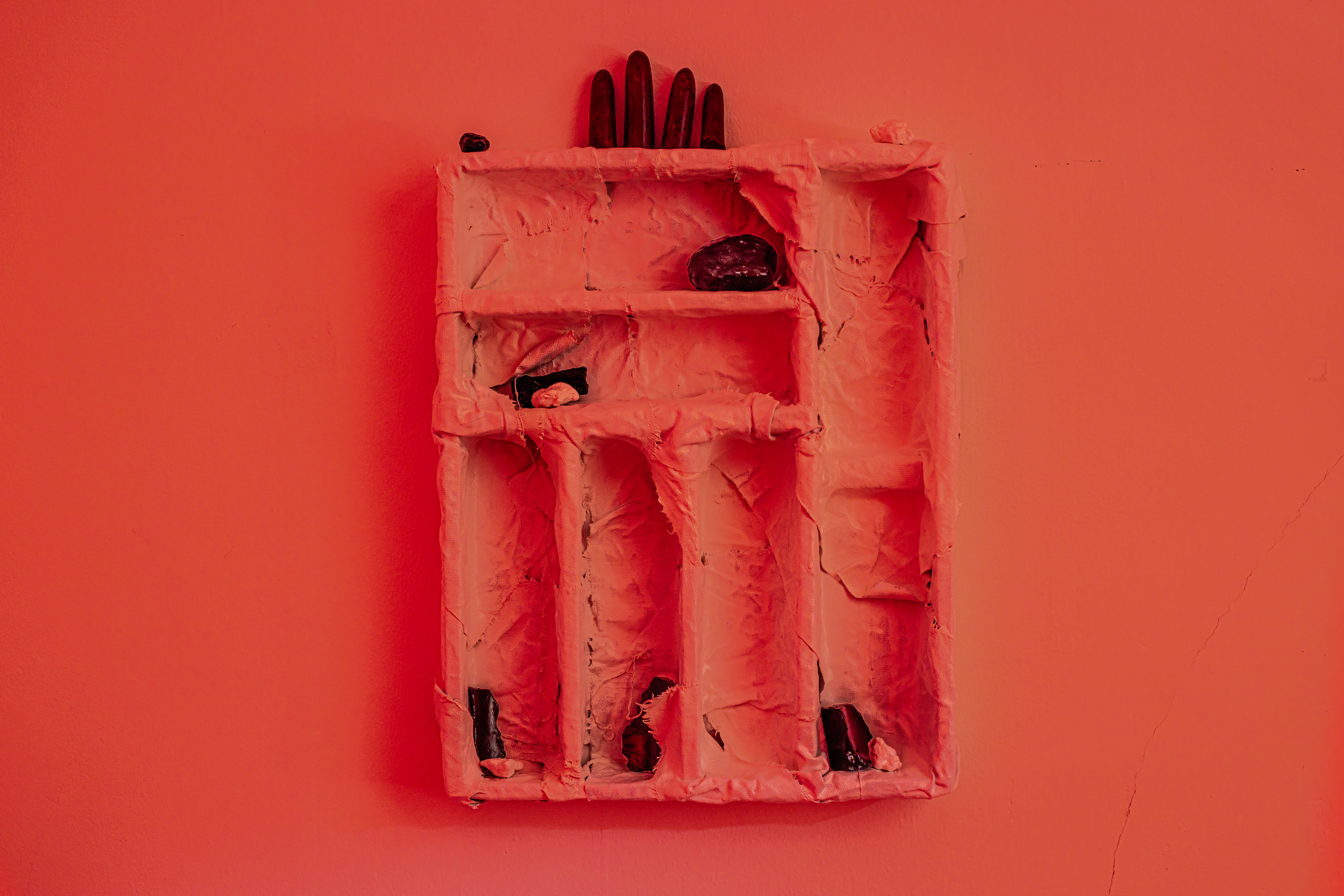 The third part of The Court Jester project, the installation A Home Is Home, explores the notions of nomadic habitat, ancestral land, borders, dispossession, forced displacement, and reconstruction. It uses the location of the Peripherie 8 space, situated on the border between Basel-City and Basel-Land, as both a chromatic and geographical reference. The pieces bear stigmata reminiscent of gutted buildings and the landscape seen from above in a war zone. The installation focuses on the Palestinian enclave of Gaza, a zone, a land, and a home for millions of people. It serves as a philosophical and personal reflection on issues of responsibility, information, and involvement, examining what it means to have—or lack thereof—a home, or not, within one’s own country.