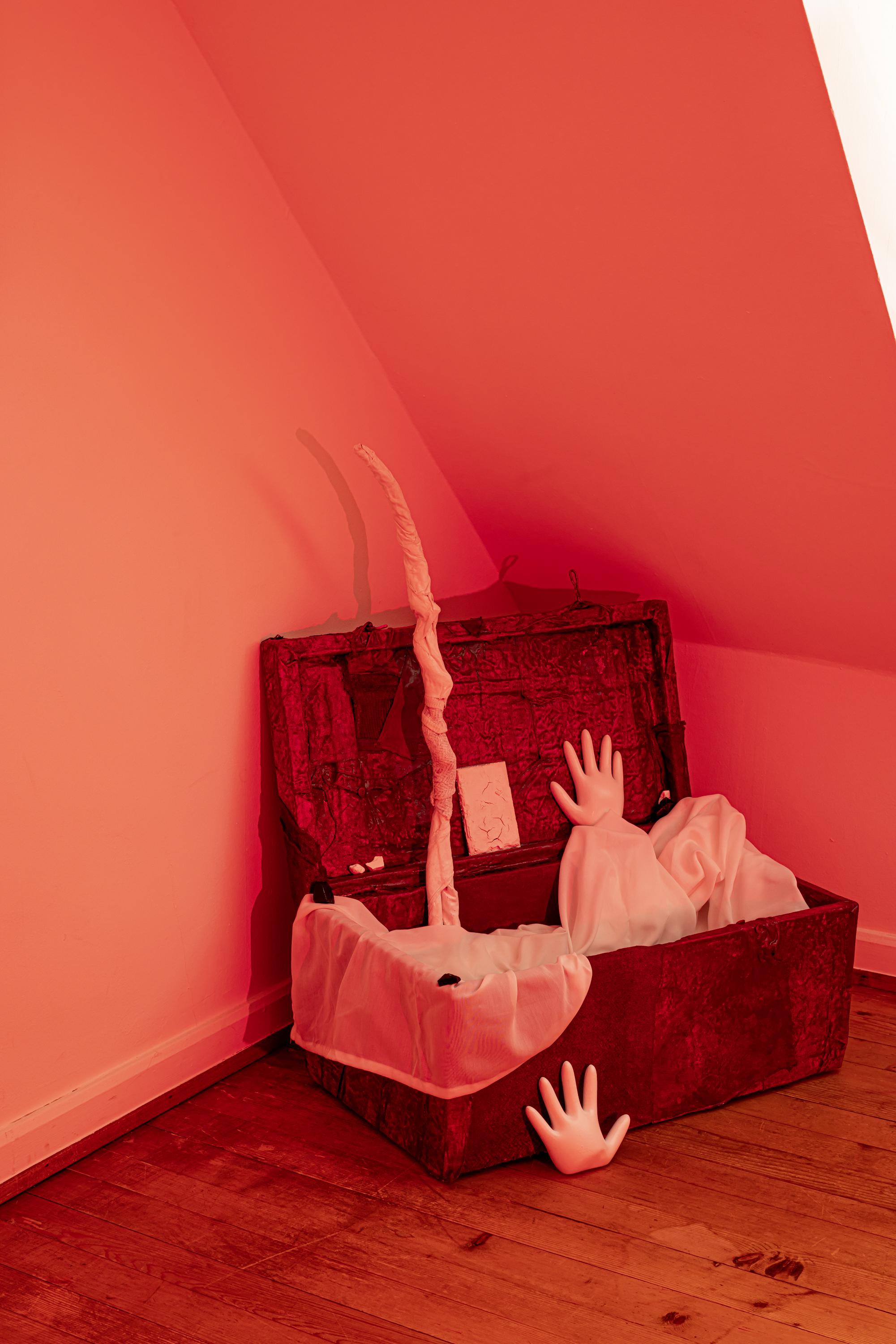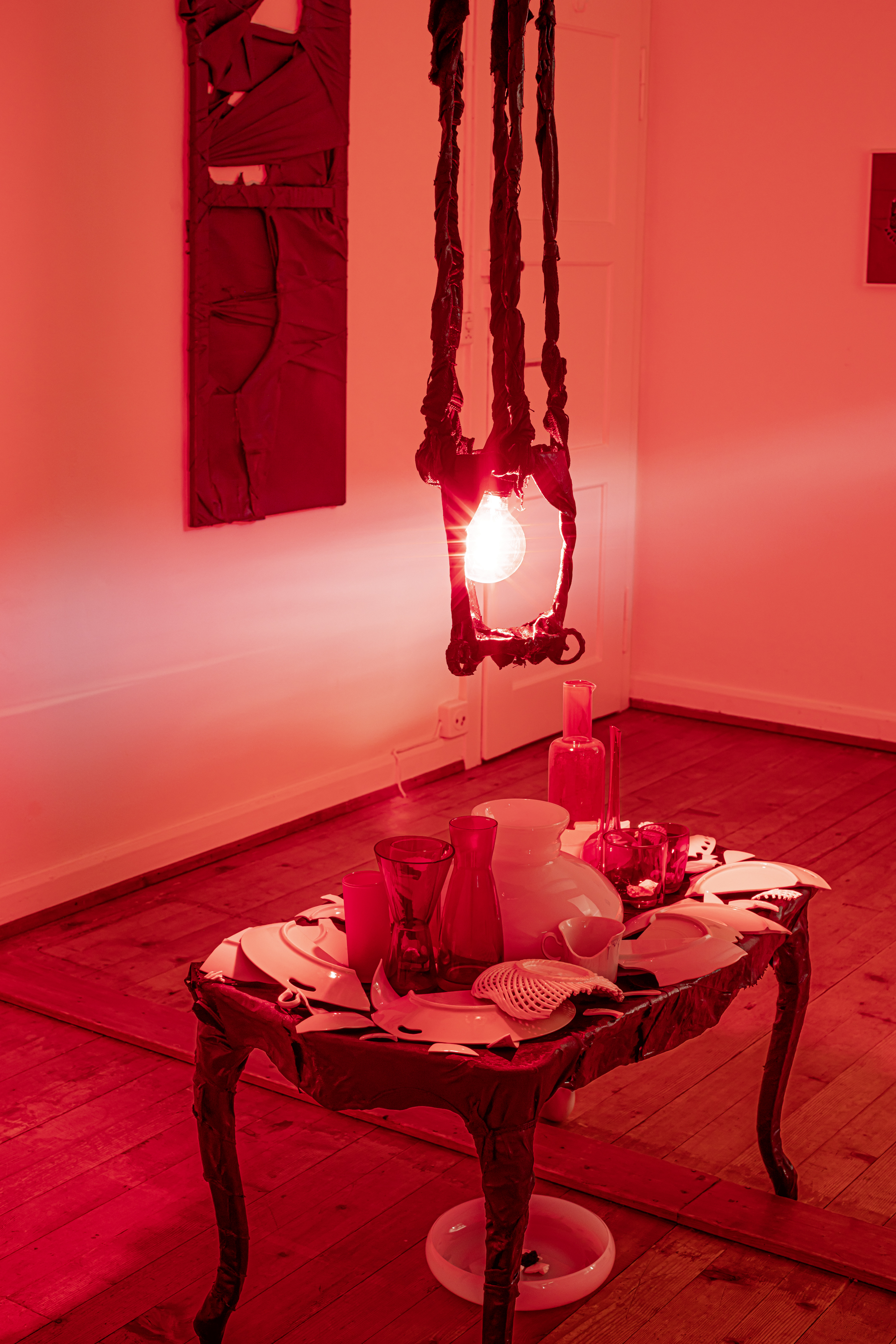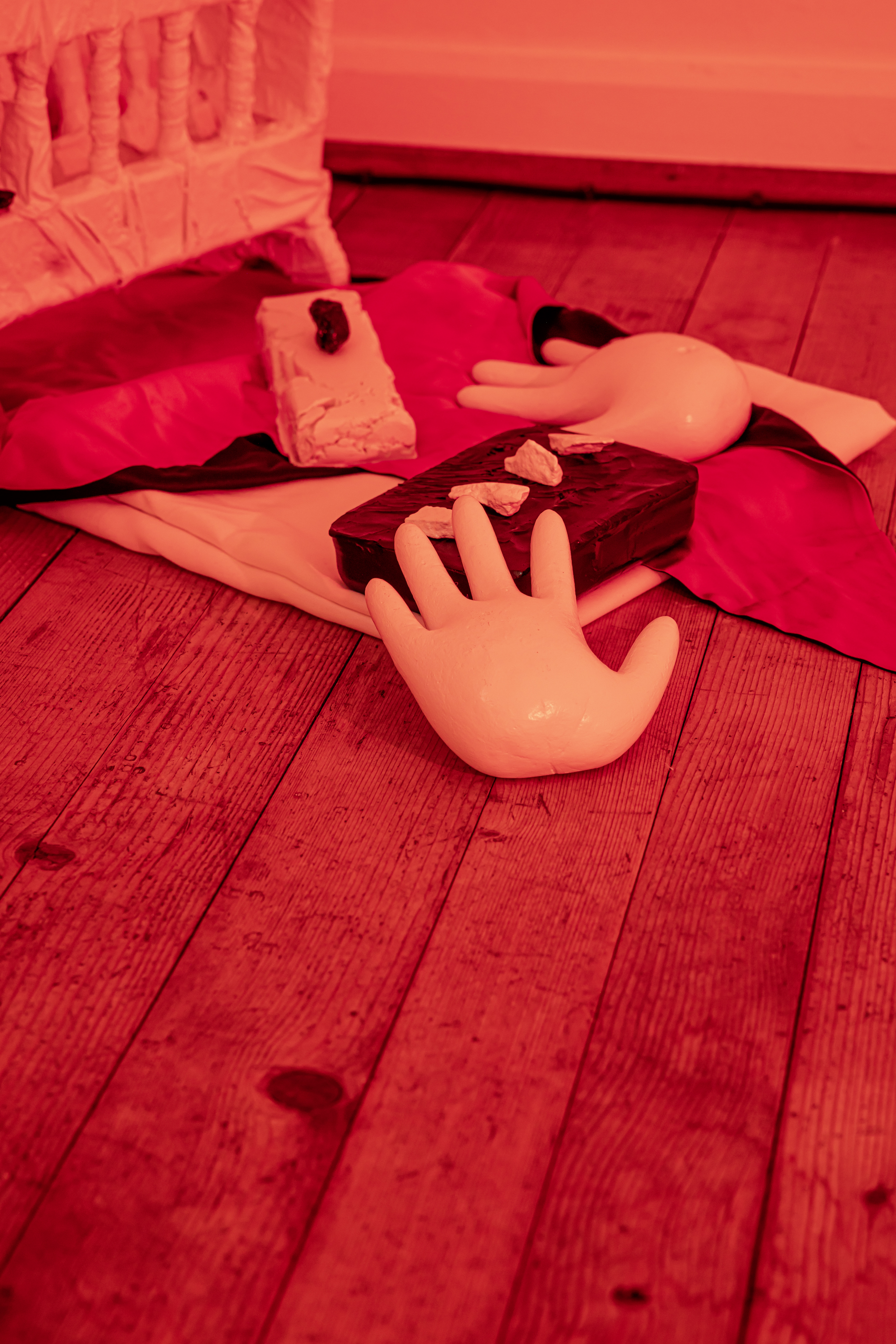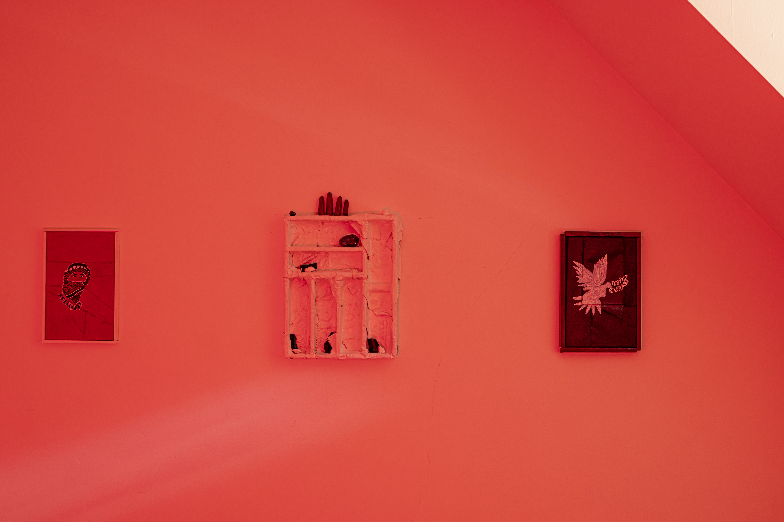 The third part of The Court Jester project, the installation A Home Is Home, explores the notions of nomadic habitat, ancestral land, borders, dispossession, forced displacement, and reconstruction. It uses the location of the Peripherie 8 space, situated on the border between Basel-City and Basel-Land, as both a chromatic and geographical reference. The pieces bear stigmata reminiscent of gutted buildings and the landscape seen from above in a war zone. The installation focuses on the Palestinian enclave of Gaza, a zone, a land, and a home for millions of people. It serves as a philosophical and personal reflection on issues of responsibility, information, and involvement, examining what it means to have—or lack thereof—a home, or not, within one’s own country.