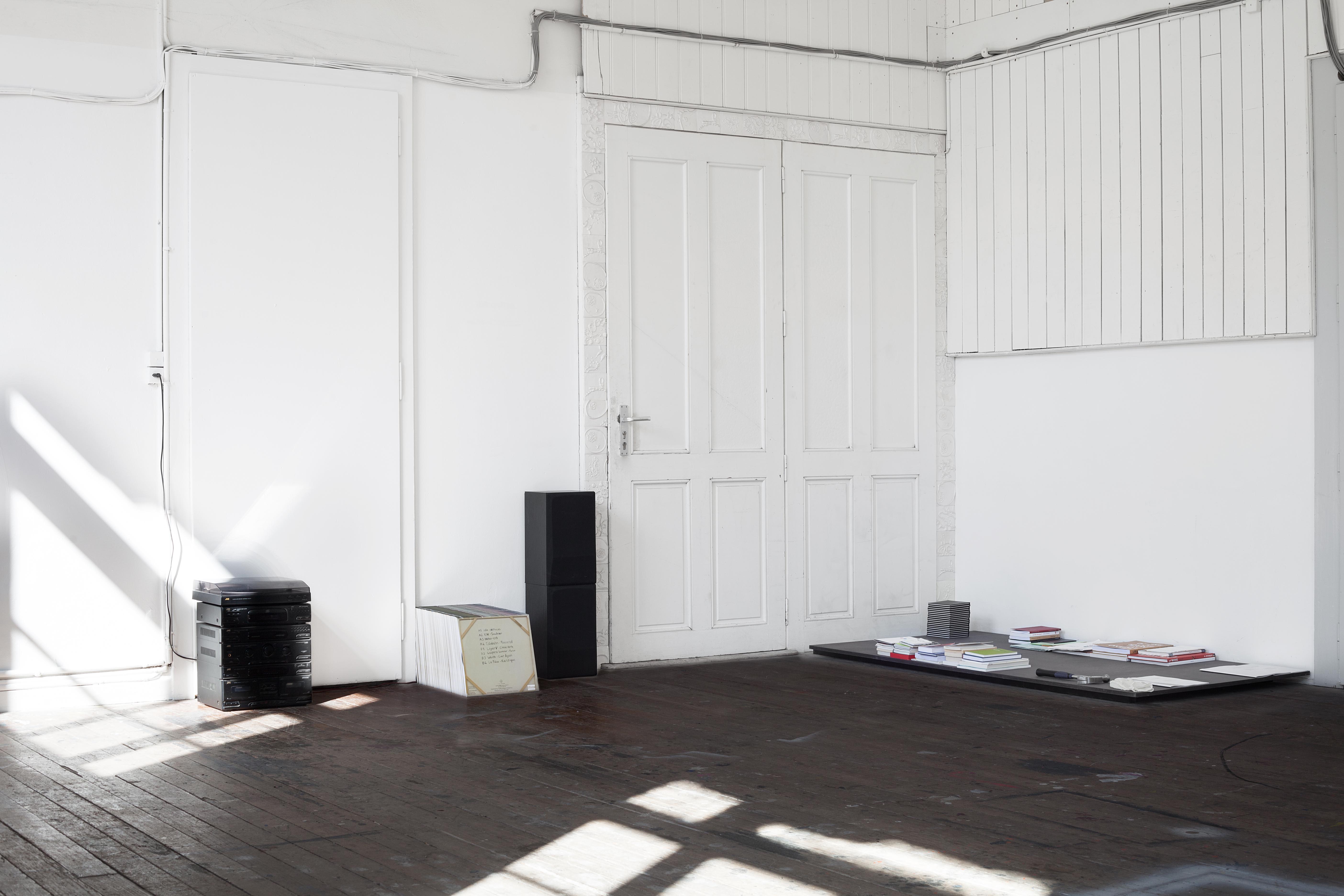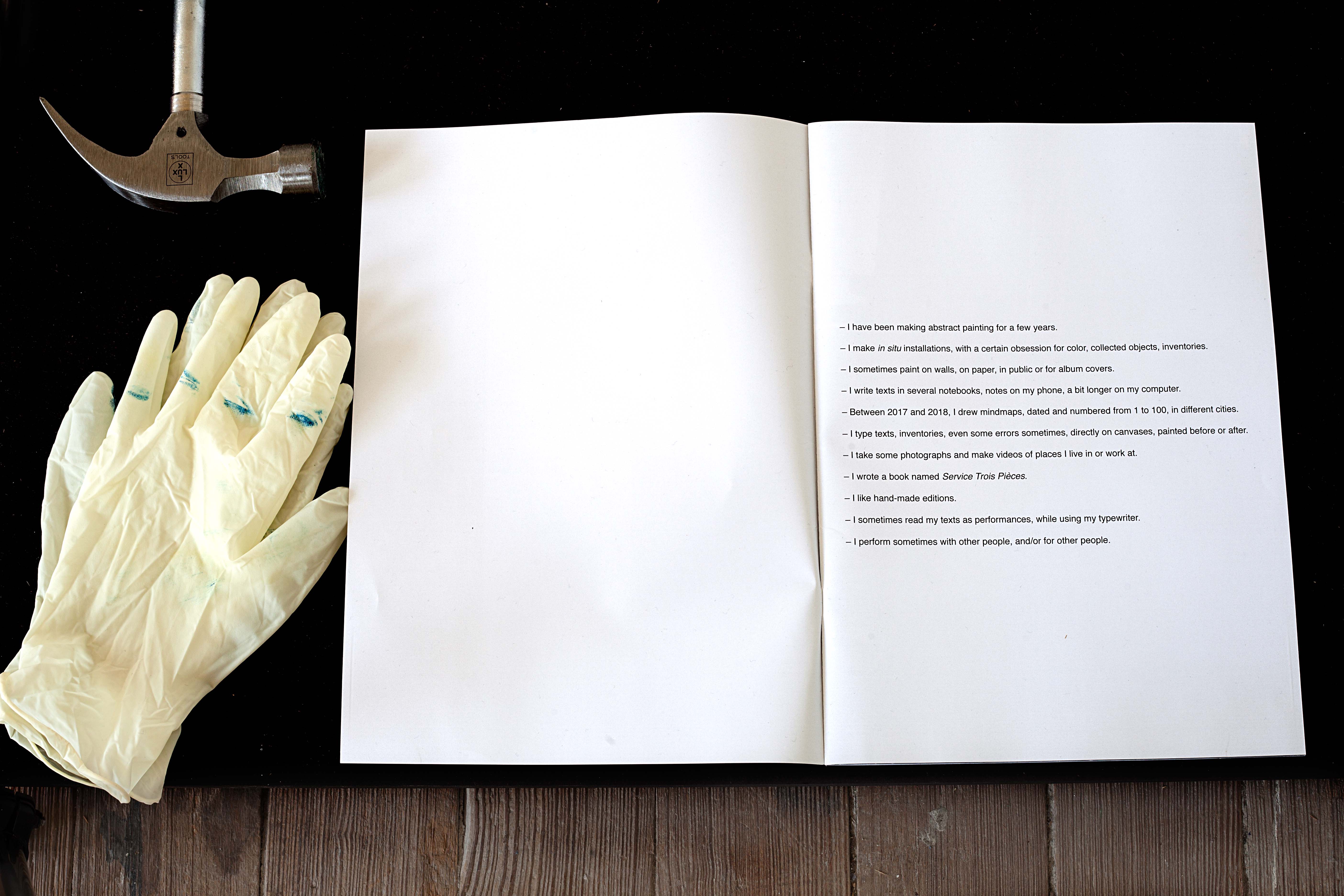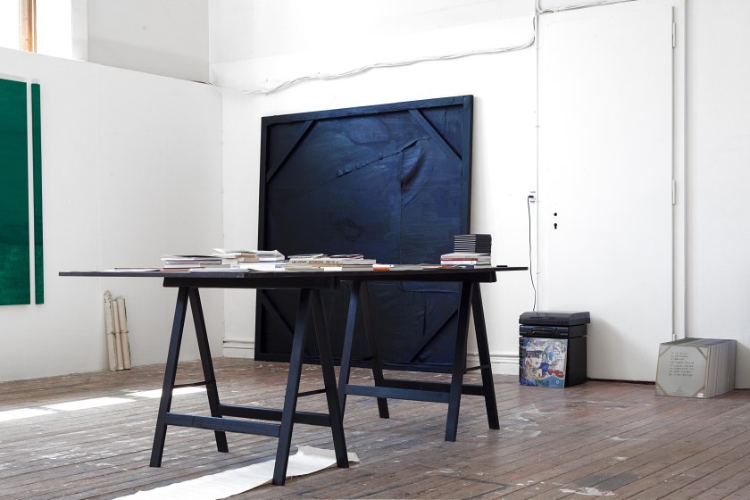 “Handmade editions.” A worktop – on which lies a whole collection of micro editions, monographs, exhibition catalogues, most of which appear in the bibliography of Service Trois Pièces – is set up on the trestles.
