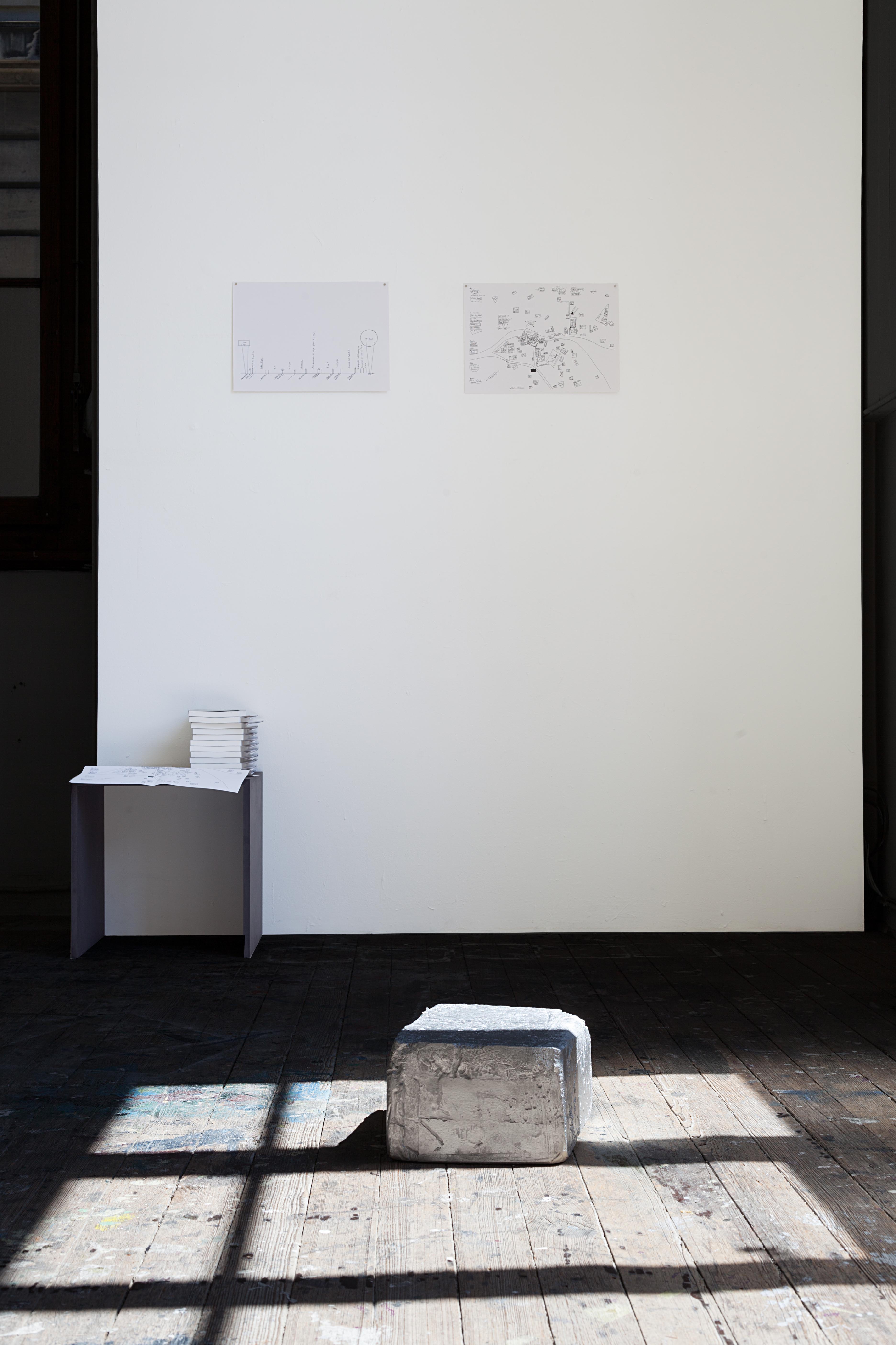 A stack of fifteen handmade editions of the book is placed on a stand, underneath the two mind maps hanging in the corner.