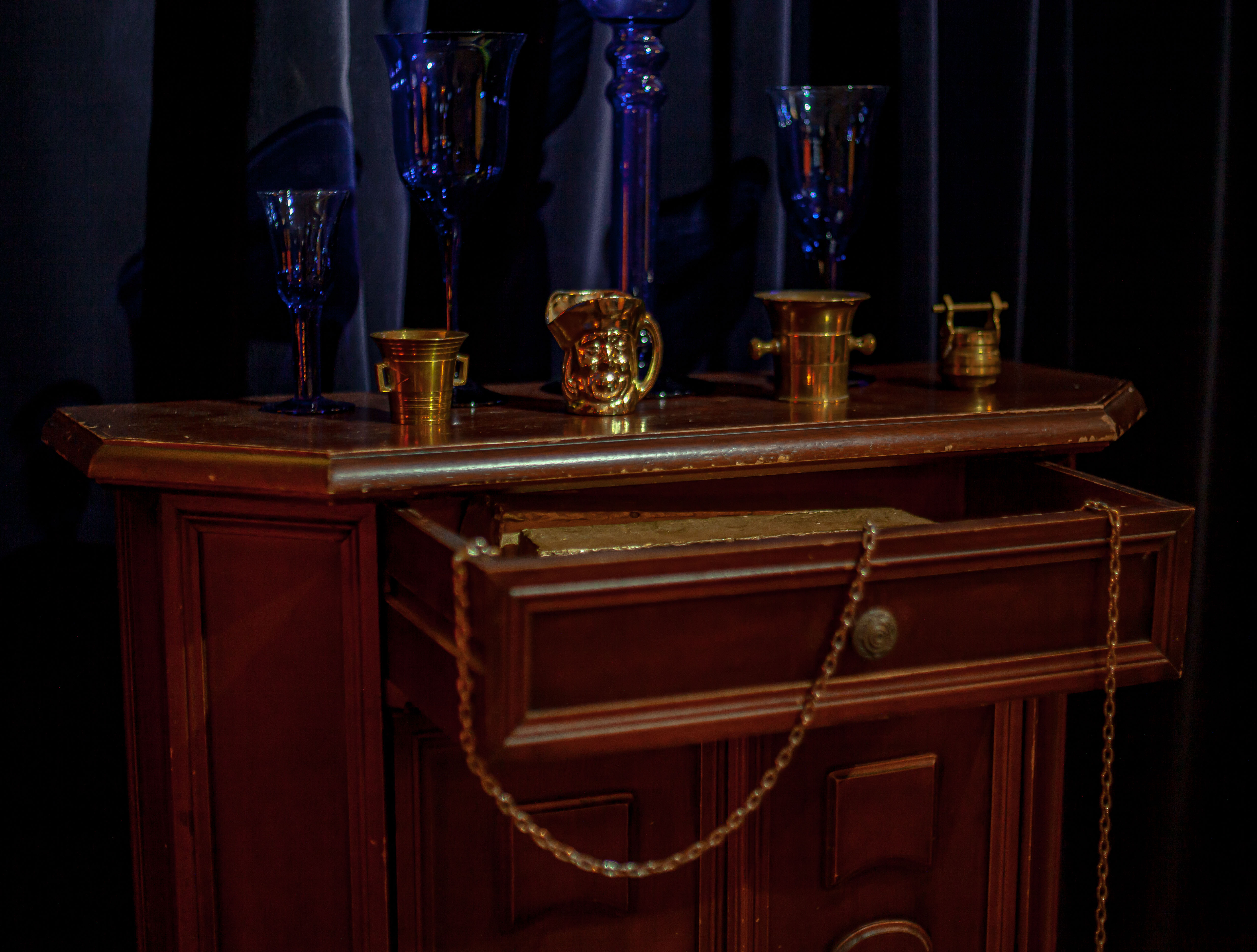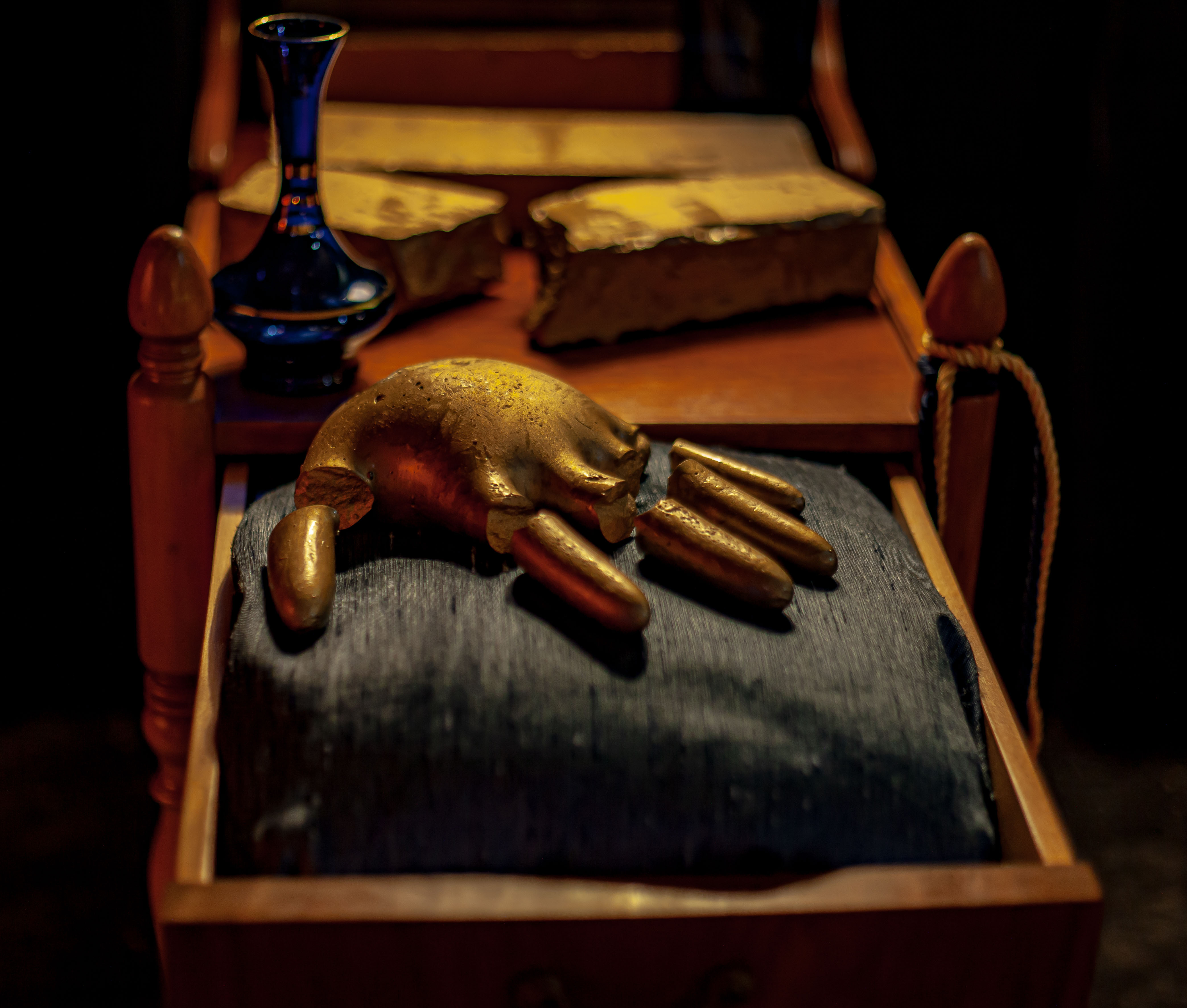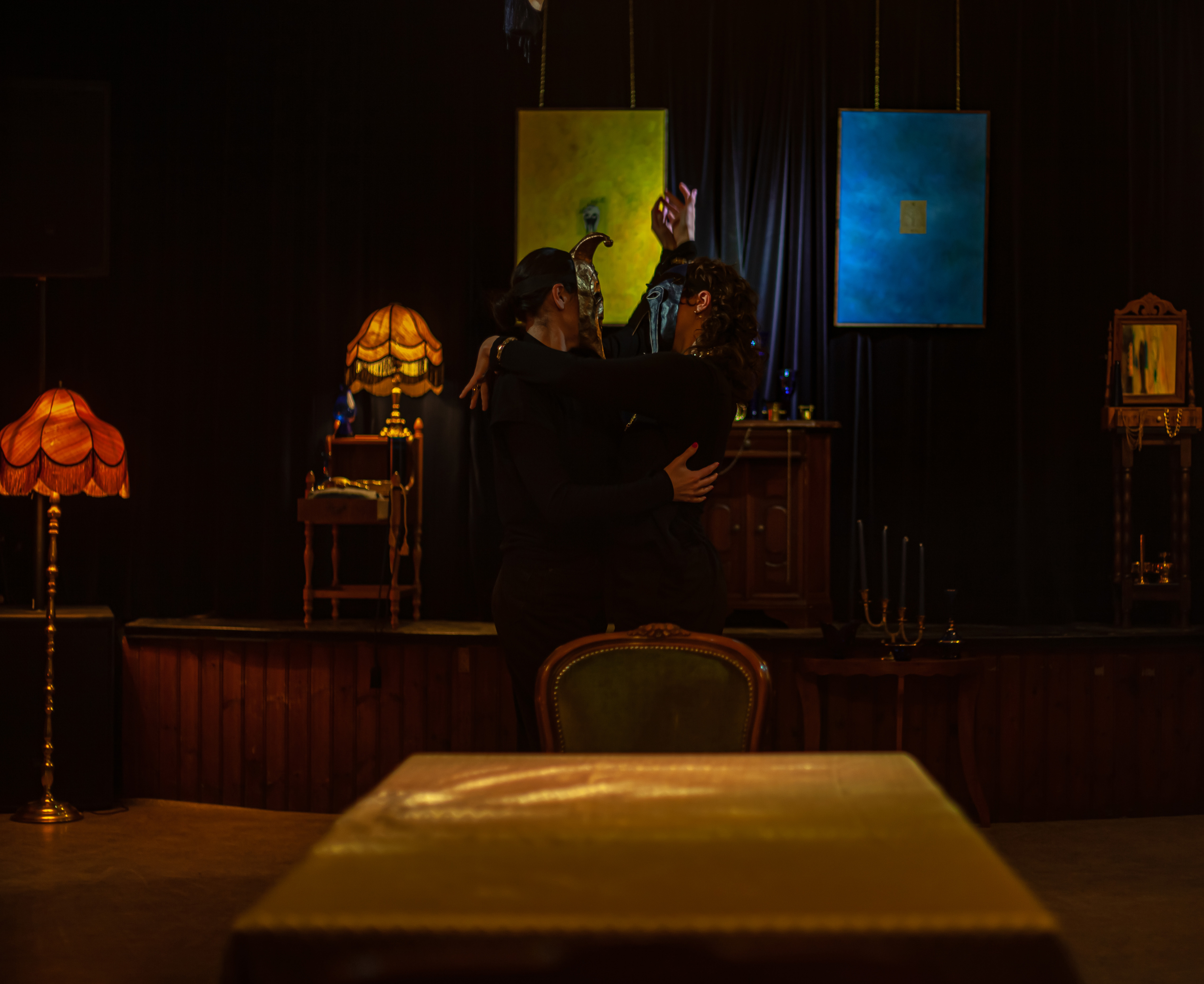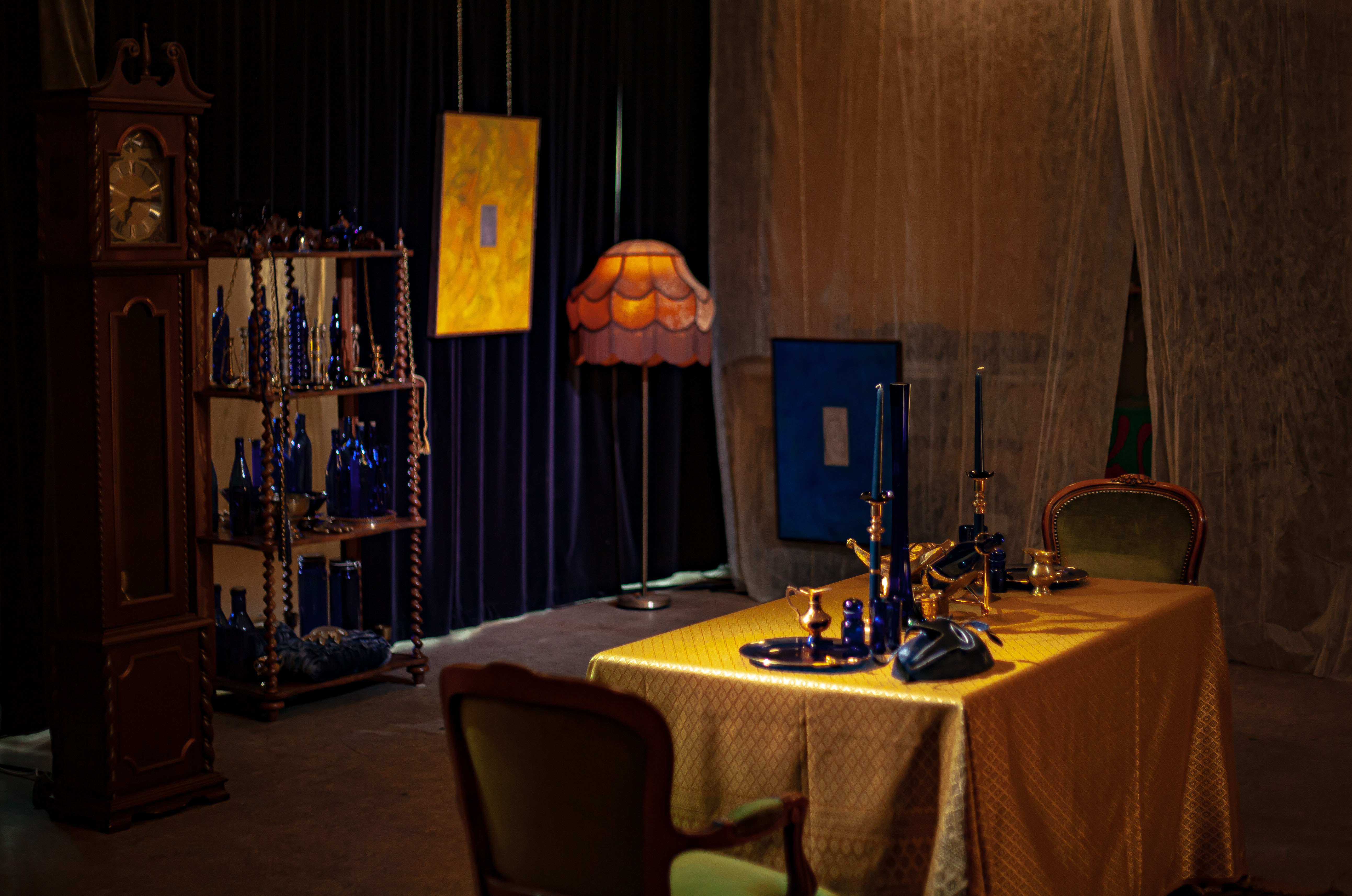 Tempus Fugit, 330 x 640 x 930 cm, installation, antique furniture and lighting, objects collected in blue glass and gilded metal, curtains, mixed media on linen, lacquer on plaster, paper mache masks, Back Beat Bolaget, Sandviken, SE, 2023 ©Samael Törnberg