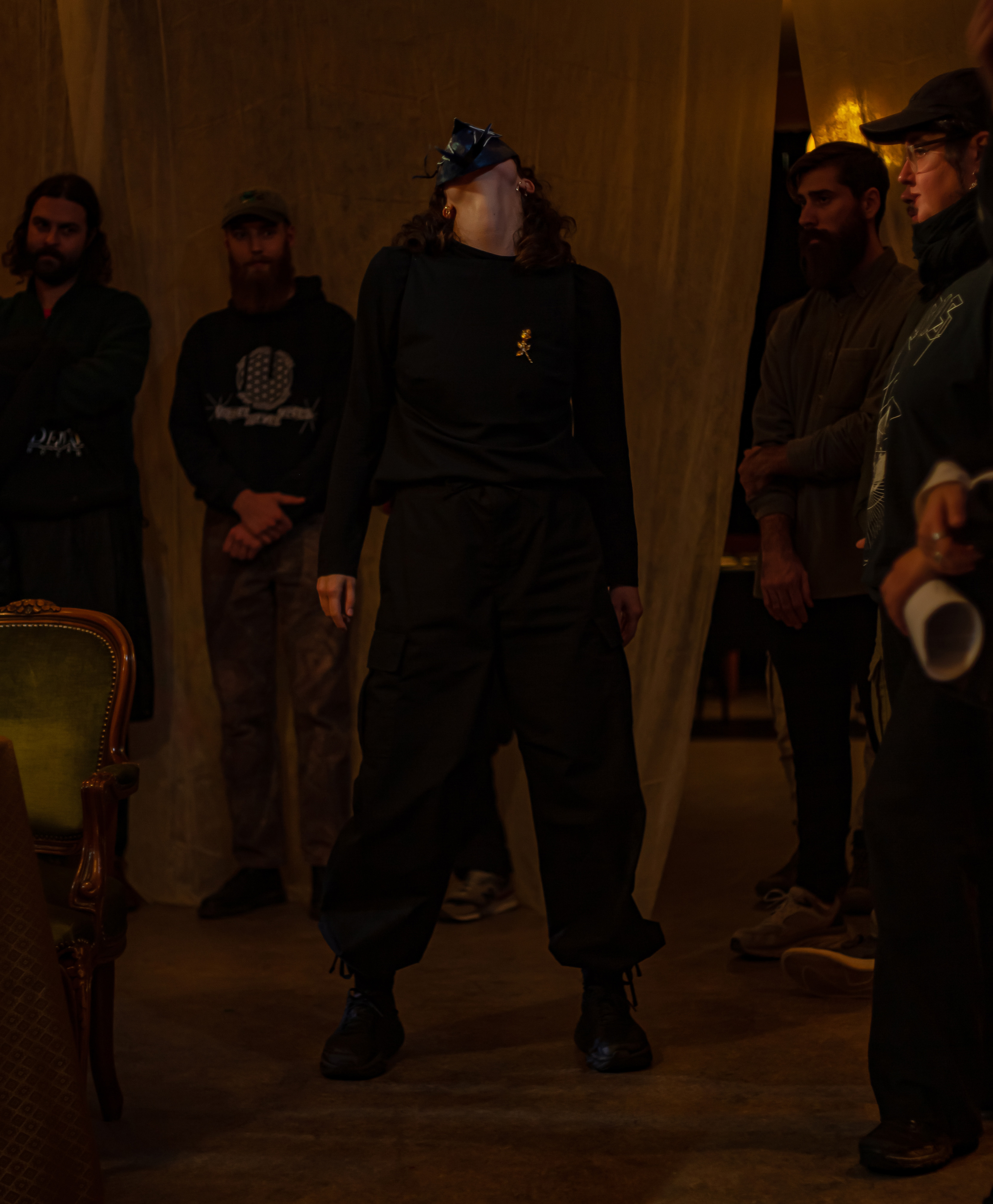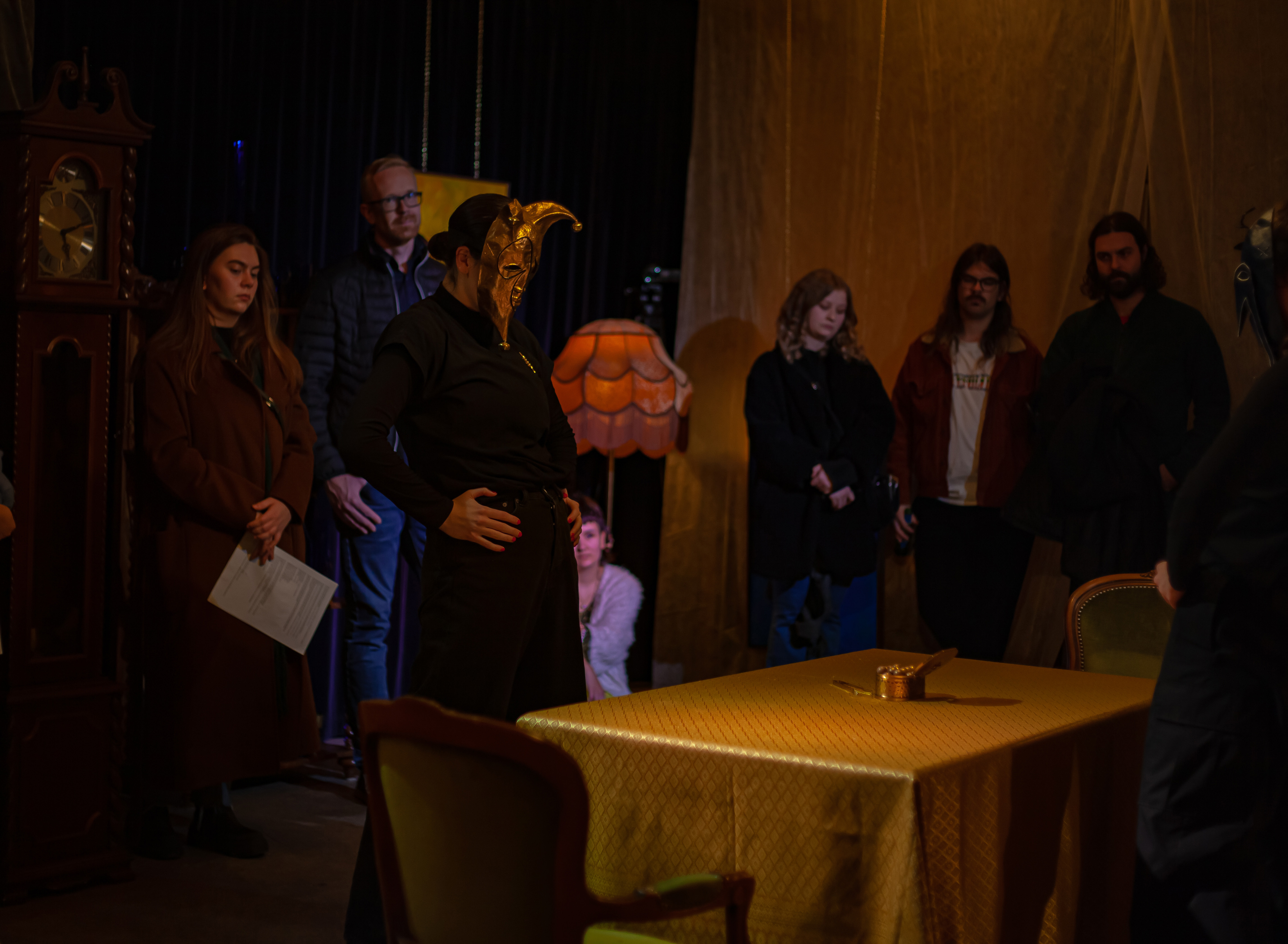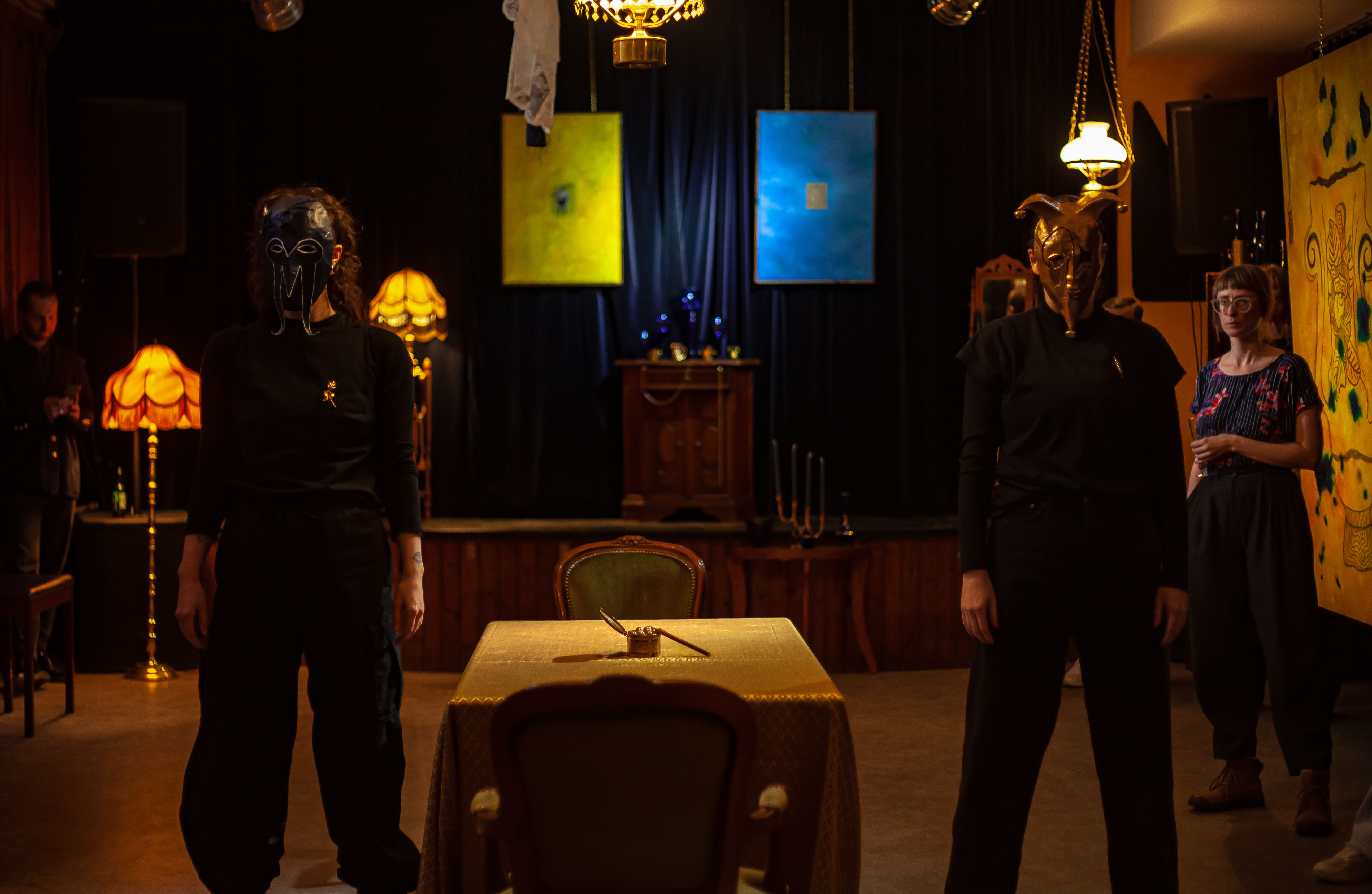 Tempus Fugit, 25′, performance, music, text, paper mache masks, found gold-plated metal brooches and necklaces, Back Beat Bolaget, Sandviken, SE, 2023 ©Samael Törnberg