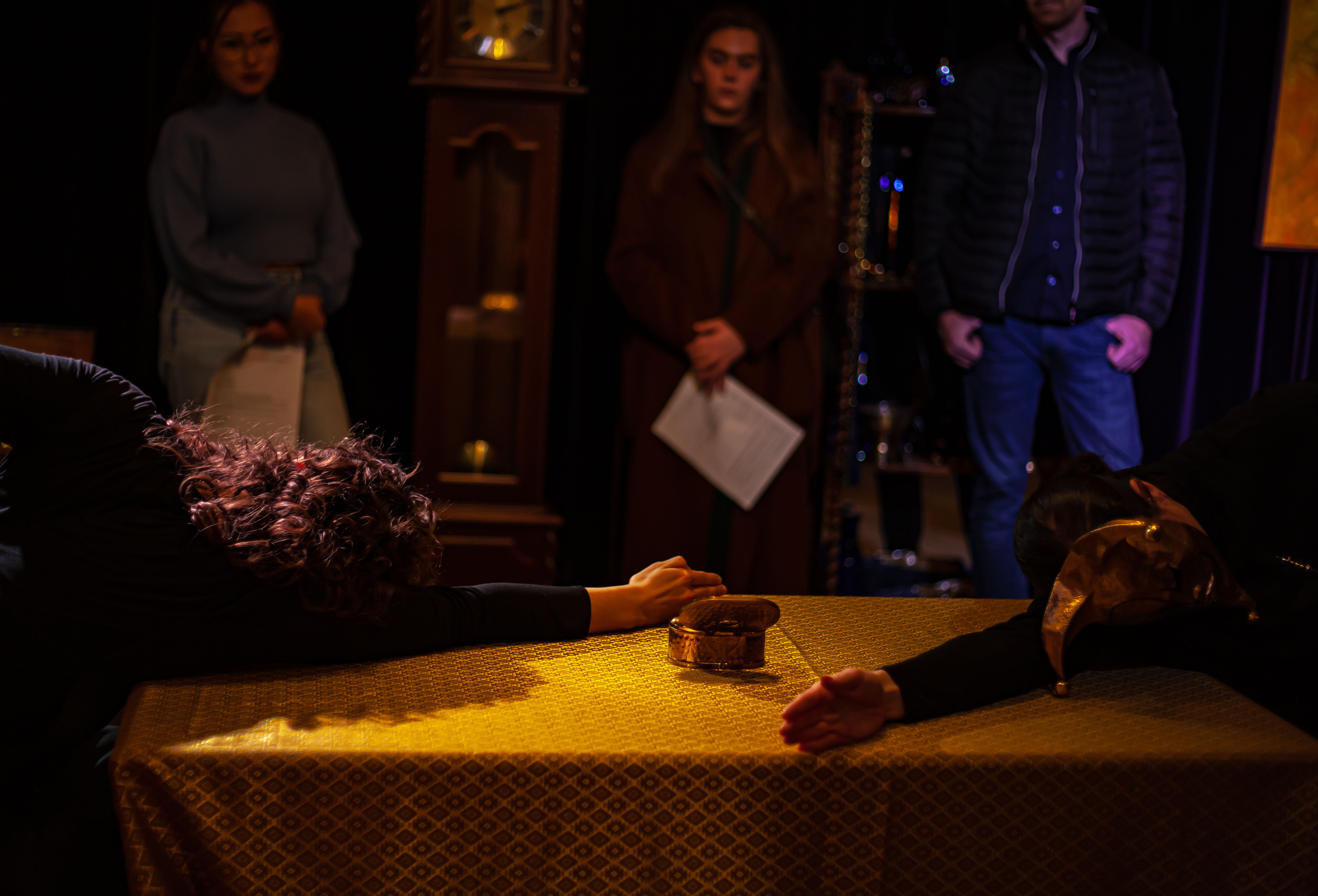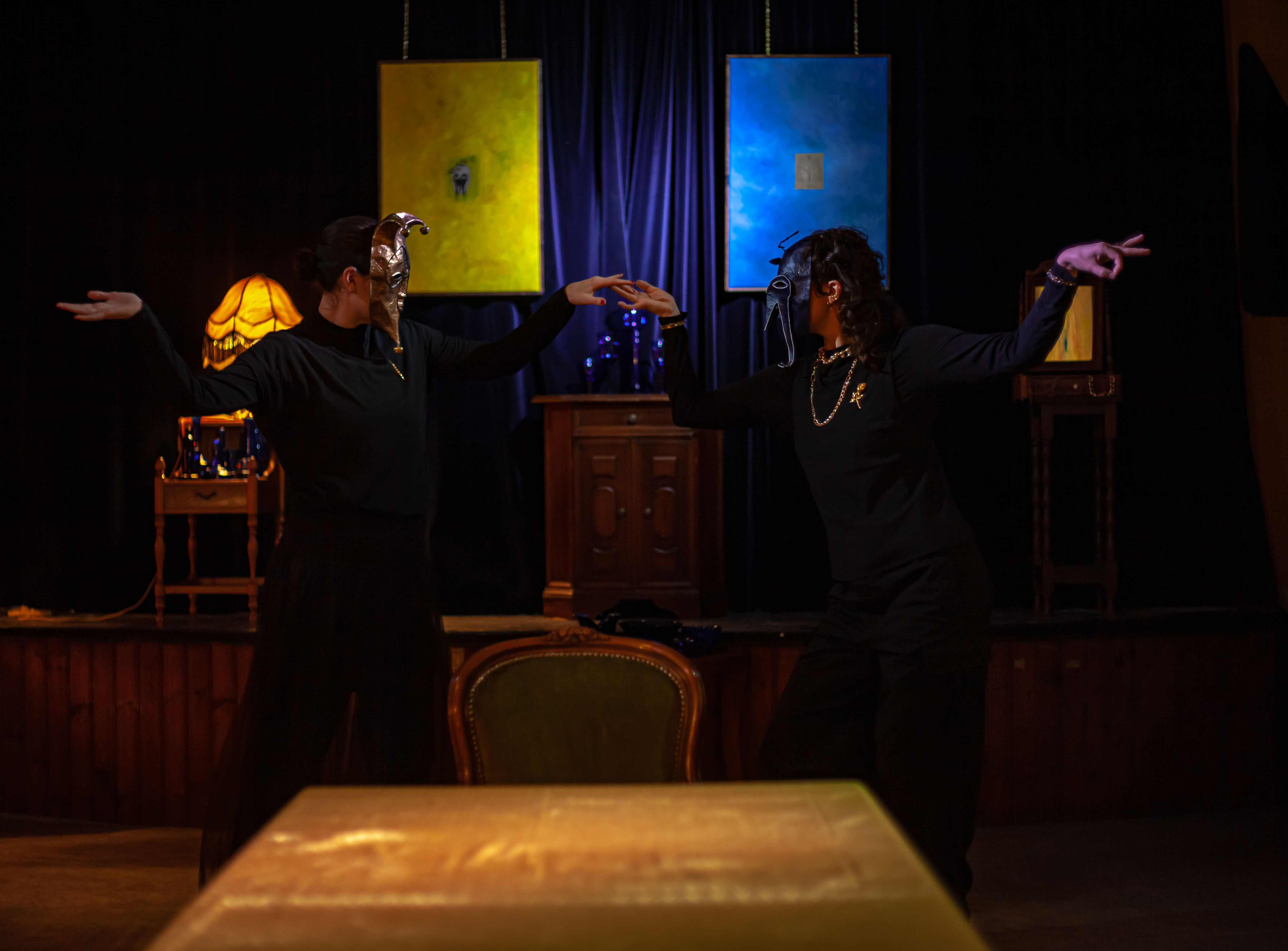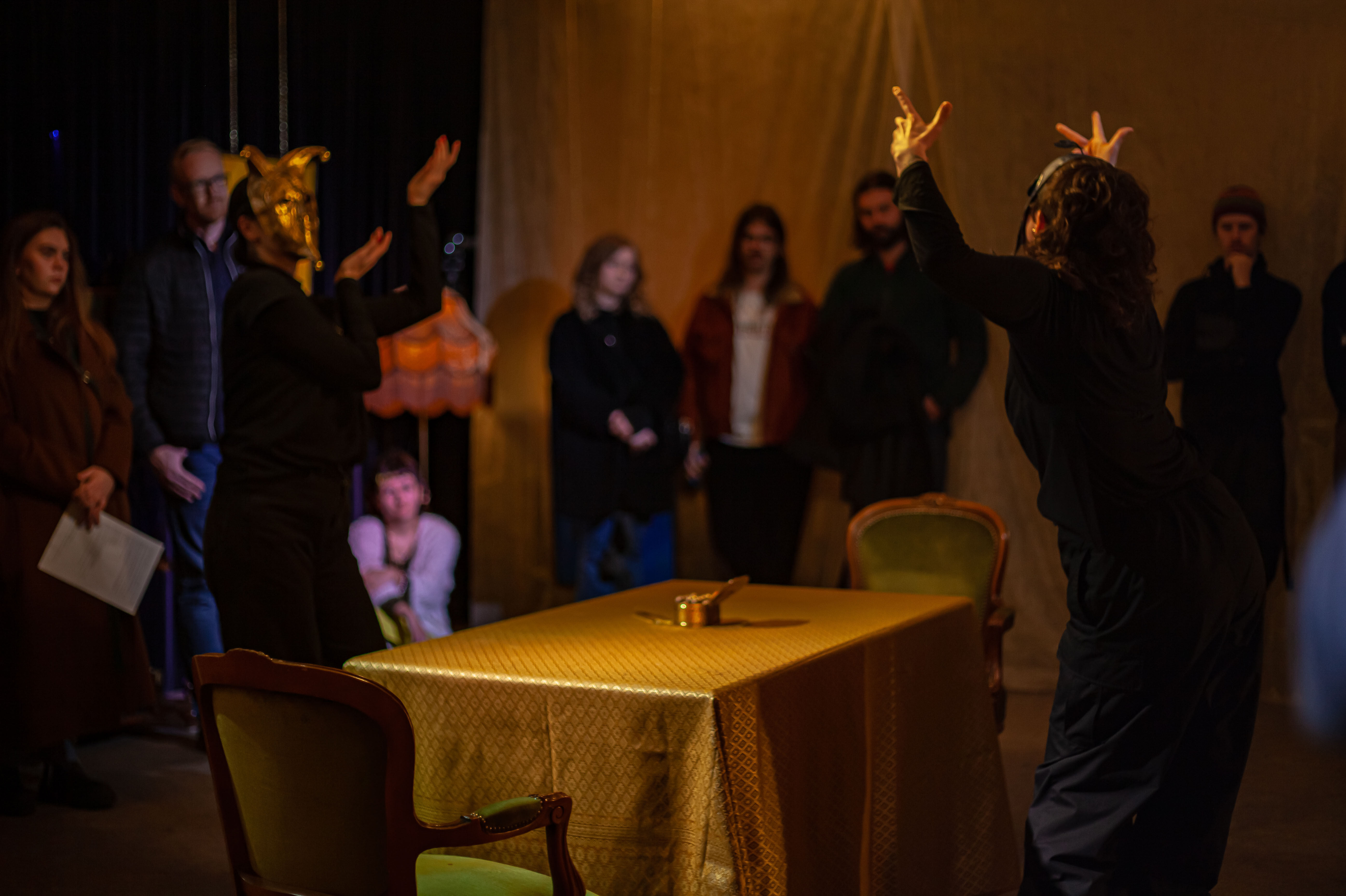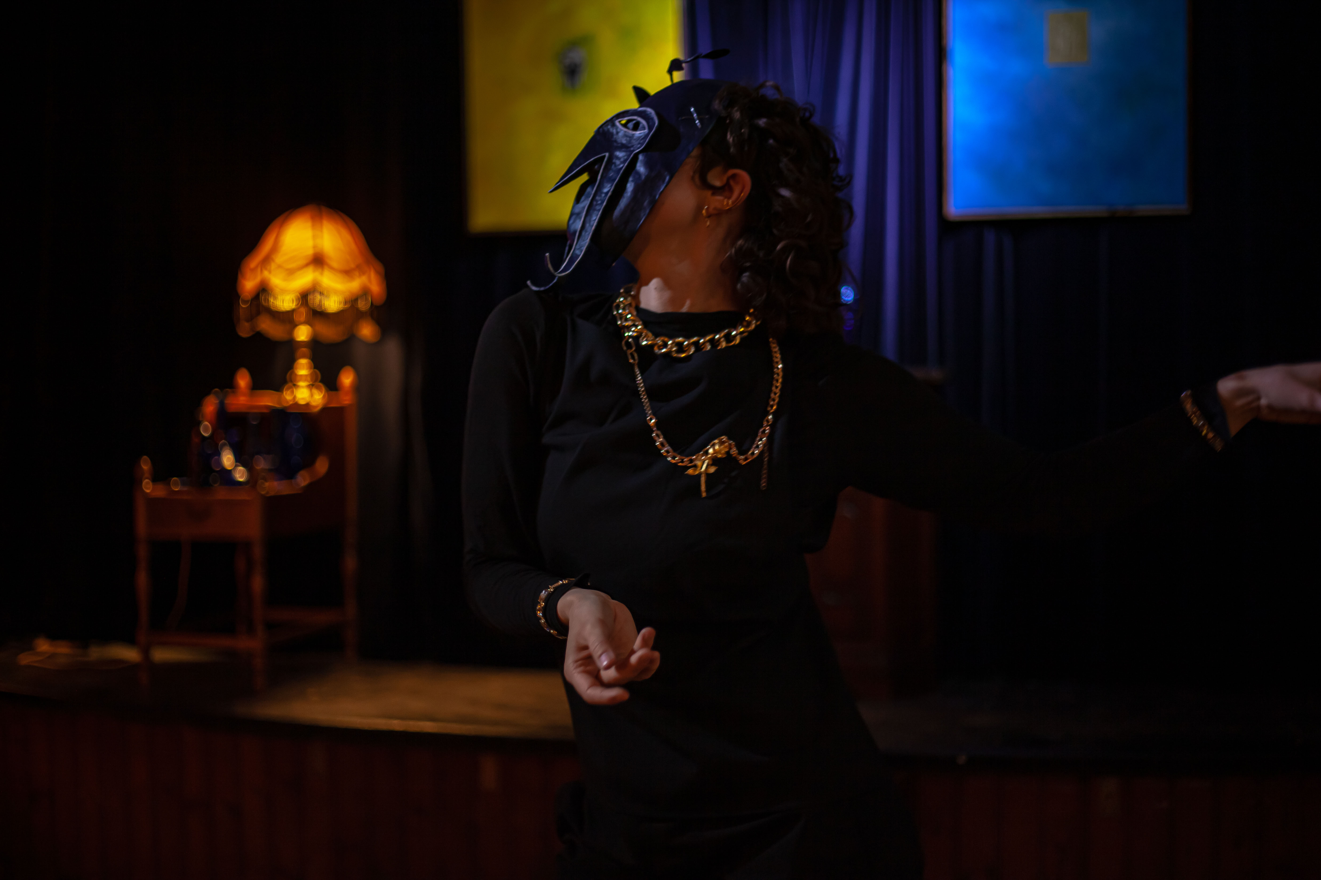 Tempus Fugit, 25′, performance, music, text, paper mache masks, found gold-plated metal brooches and necklaces, Back Beat Bolaget, Sandviken, SE, 2023 ©Samael Törnberg