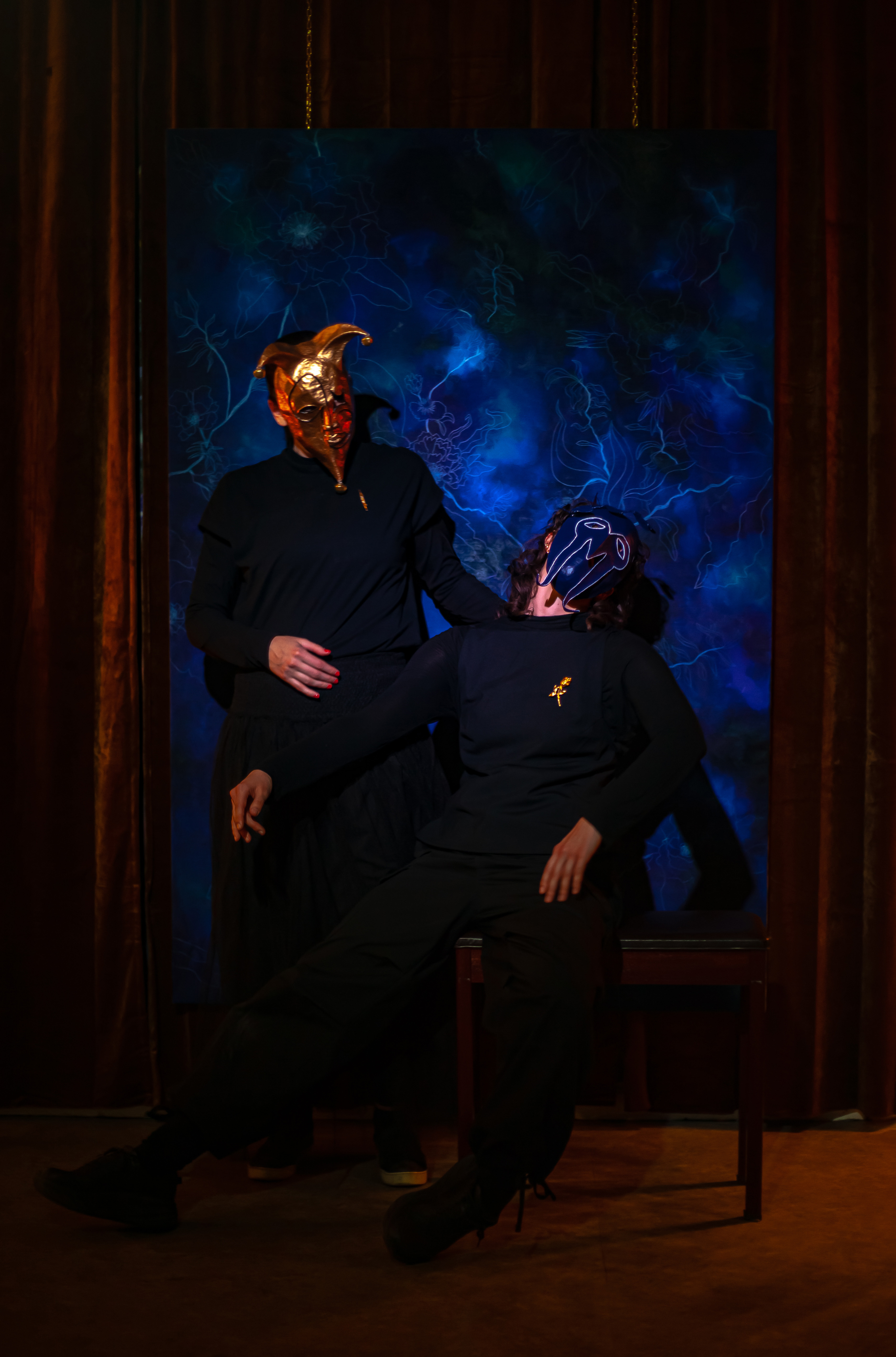 Tempus Fugit is inspired by the imagery of the court jester, the mask and the party, social role-playing or seduction, sarcasm or masquerade. Tempus Fugit or the frantic race forward. An attempt to grasp the meaning of two colours through stories – The gold of light, the world and value and the blue of dreams, the royal family and work.